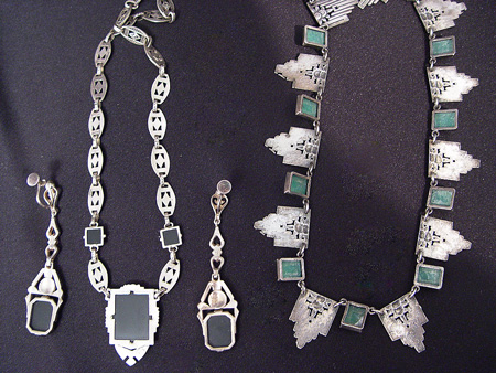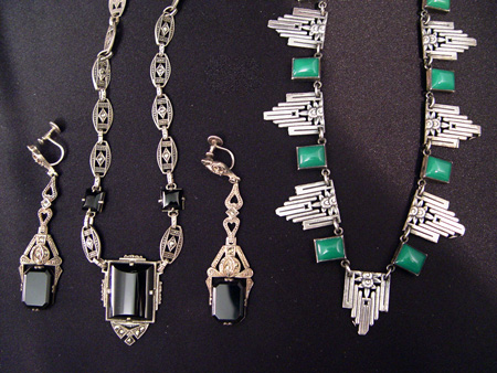 ESTATE ART DECO JEWELRY LOT: To include, onyx & marcasite necklace and earrings set marked Sterling. Necklace 16 1/2''l., screw back dangle earrings 2 5/8''l. And a necklace of silver colored metal links alternating with rectangular cabochons of green, 16''l. Sold as a lot.