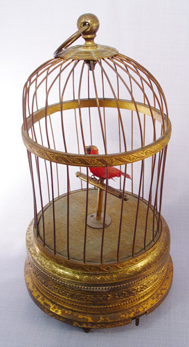 SINGING BIRD AUTOMATON: Brass cage with red feathered singing bird. In good working order, the cage is in age relevant condition. 10 1/2''h., the base is 6 1/2'' dia.