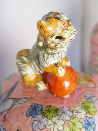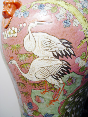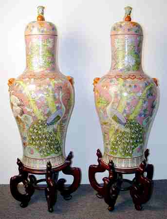 PAIR OF TALL CHINESE COVERED URNS: Crane and peacock motif on rose colored ground. Foo Lion Finials on the covers. Please note the covers are puttied on. Signed on the underside. 34 1/2''h, the wooden stands are an additional 10''h. Age unknown.