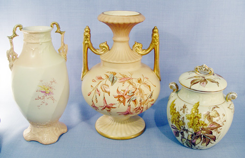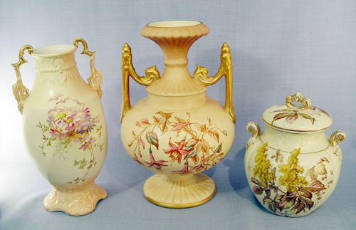 3 PIECE 19TH C BLUSH PORCELAIN: Includes Royal Devon vase 11 1/2'' h., Rudalstadt vase 11'', and a B & M Co. Biscuit jar.
