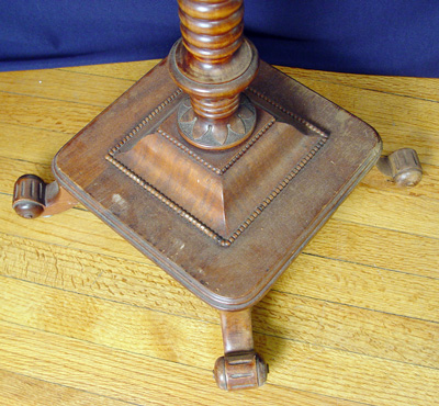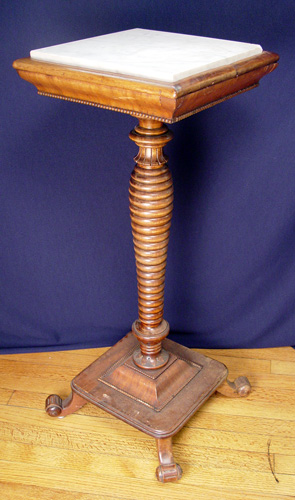 19TH C WALNUT MARBLE TOP PEDESTAL: Twist carved base, scroll feet, square white marble top. 14'' x 13 3/4'' top, 35 1/8'' h. Est. $200/400**