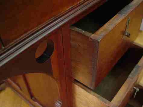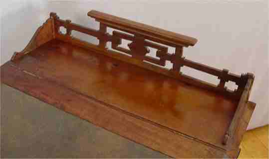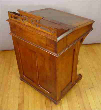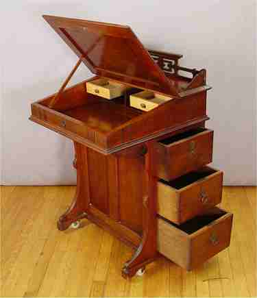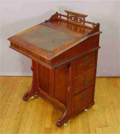 19TH C VICTORIAN DAVENPORT DESK: Compact desk with leather top slanted top that lifts for storage. Pierce carved gallery, 3 drawers on the side, one missing a pull ring. Later casters. 36''h. x 23'' x24''.