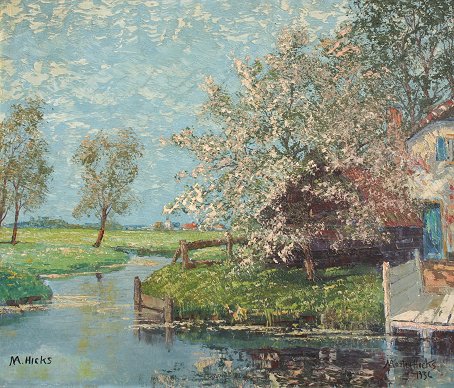 HICKS, Morley, (American, 1877-1959): Apple Blossom Time on the River, O/B, signed twice, dated 1936, sight size 21 1/2'' x 25 1/2'', worn frame with pieces missing, 26 1/2'' x 30 1/4''.