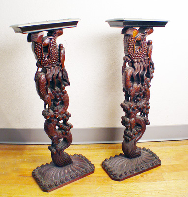 2 YAW TAY CHINESE CARVED SMOKE STANDS: A matched pair of stands with removable metal inserts. Companion pieces from the same manufacturer of the previous dining set. 27''h, the bases are 11'' x6''.