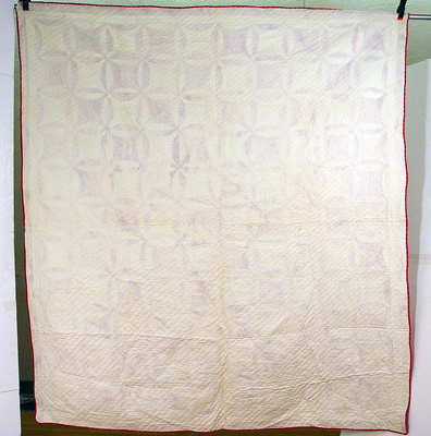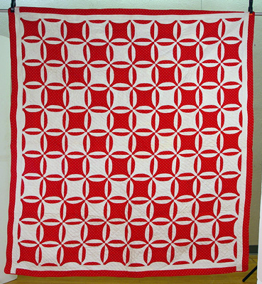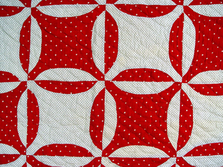 VINTAGE RED AND WHITE HAND SEWN QUILT: Navy on red polka dots and white on red polka dots. Approx. 73'' x 81''.