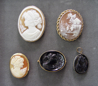 ESTATE LOT OF CAMEO JEWELRY: Five cameos to include, signed soft shell cameo delicate profile of a girl, marked verso on the shell ''Bomello'', in a silver and gold frame pin/pendant marked 925 596 NA, 2'' x 1 1/2''. Scenic soft shell cameo in silver frame with gold tone rope trim, 1 3/4'' x 1 1/2''. Soft shell cameo maiden profile in a 10k gold frame, marked 585 NA, 1 1/2'' x 1 1/8''. Mourning cameo of black onyx, carved with maiden and flowers, in a gold wire frame that acid tests 18k, 1 1/4'' x 1 5/8''. And a carved onyx cameo pendant, gold tone metal frame, 1 1/4'' x 1''. Sold as a lot.