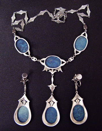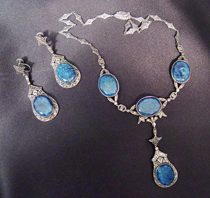 GERMAN SODALITE & MARCASITE ENSUITE: Lovely set with lavalier style necklace, 16''l. plus 2 1/2'' dangle, pressure clasp with safety latch, missing one very tiny marcasite on clasp. Screw back dangle earrings 2 1/8''l. All pieces marked Germany Sterling.