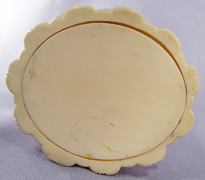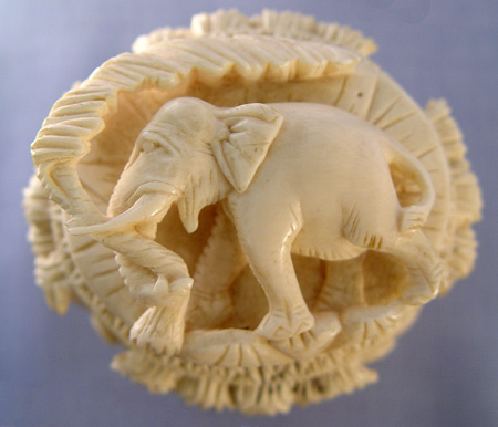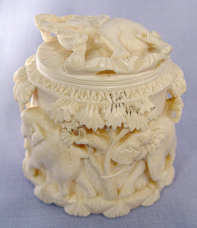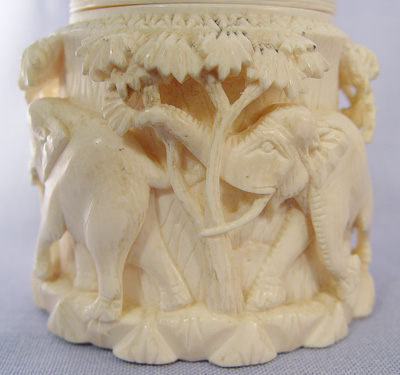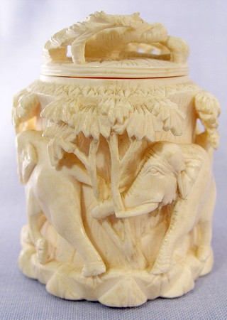 CARVED IVORY ELEPHANT COVERED BOX: Deeply carved march of the elephants among the trees. 4'' h., 4'' dia.