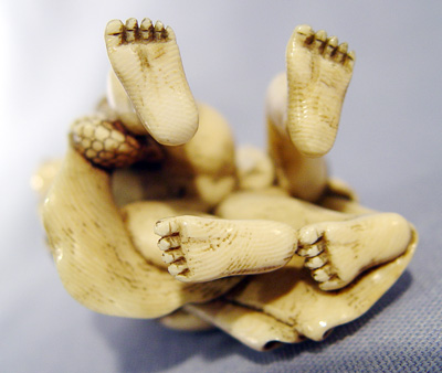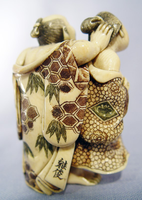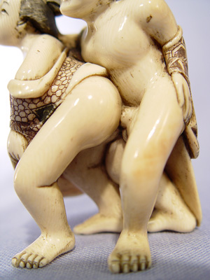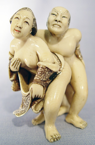 JAPANESE CARVED IVORY EROTICA FIGURE: Full body of man and woman, signed on the gentleman's robe. 3 1/4'' h.