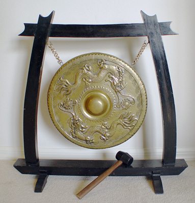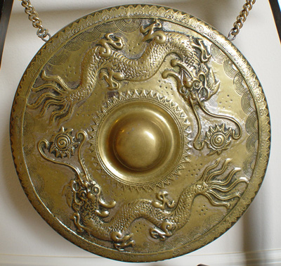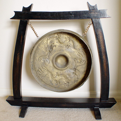 CHINESE DRAGON MOTIF BRASS GONG: Hanging from a stand, sold with the hammer. The brass is 15'' dia. The stand is 26''h. x 28''.