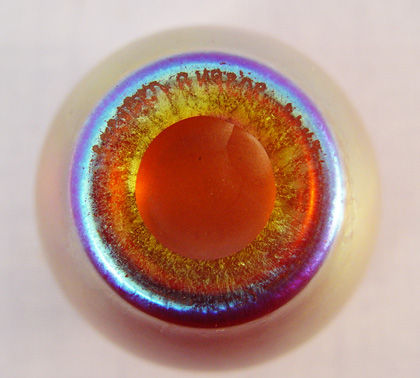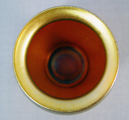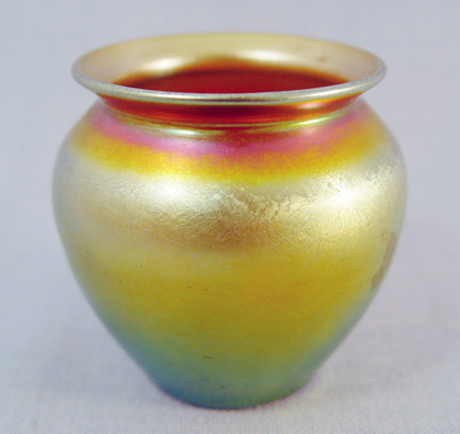 MINIATURE STEUBEN AURENE ART GLASS VASE: Gold iridescent art glass, 2 1/2''h. 2 1/2'' at the rim. Signed ''Steuben Aurene'' and illegible numbers.