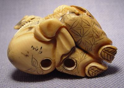 CARVED IVORY NETSUKE OF MAN WITH RAT: Man with pet rat wearing a jacket sitting on a full bag, signature to bottom of bag, approx. 1 1/2''h.