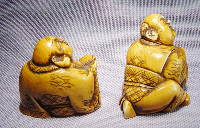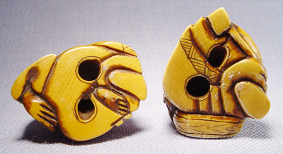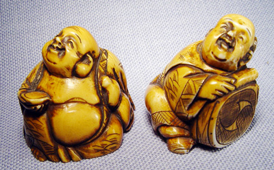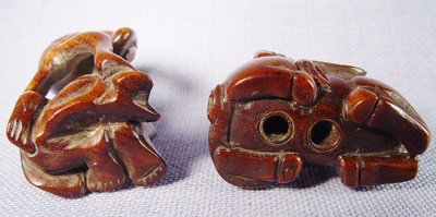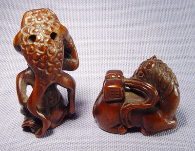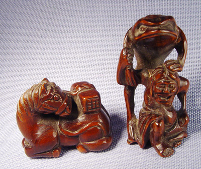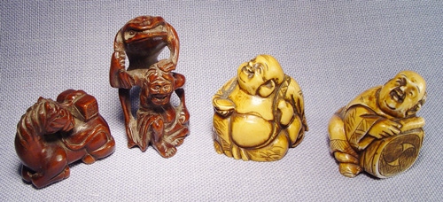 LOT OF 4 NETSUKES: Two carved of wood - pack horse 1 3/8''l. and a frog stretching over a man, 2''h. Two carved from ivory - Buddha, 1 1/4''h. and a seated musician with drum, chip to nose, 1 3/8''h. No signatures noted on any figure.