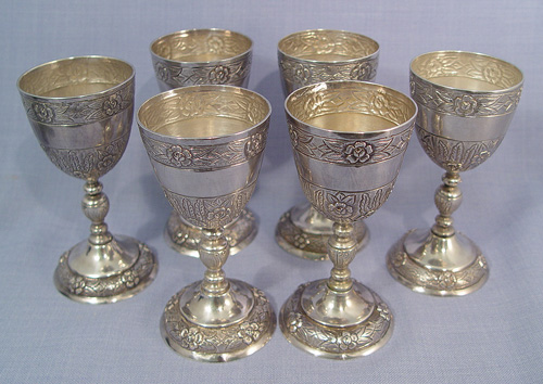 SET OF 6 SANBORNS STERLING SILVER GOBLETS: 5 1/2'' wine goblets with floral design, marked to bottom Sanborns Mexico Sterling. Each weighs 6.4 troy oz., total for set approx. 38.4 oz.