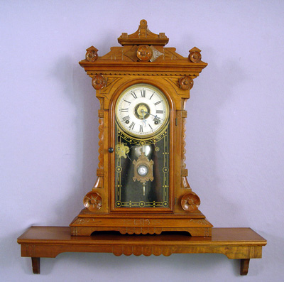 VICTORIAN GINGERBREAD KITCHEN CLOCK WITH SHELF: Alarm clock in fine walnut case, original pendulum, bell strike, key wind. 23''h. The matching walnut bracket shelf is 25 1/2''l.
