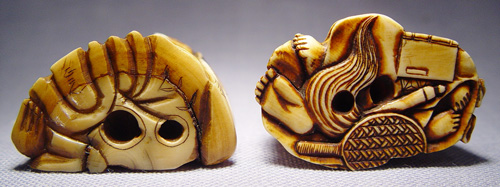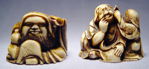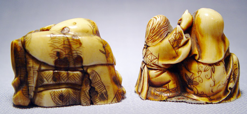 LOT OF 2 CARVED IVORY NETSUKE FIGURES: Single man with bag and cup, age cracks and chip inside one himotoshi, signature to of right foot, 1 5/8'' x 1'' x 1 1/8''. Double figure with wonderfully detailed carving that continues even on the bottom with a fly wisk, fan and book, please note chip to edge of fan, and their feet, 1 3/4'' x 1 1/8'' x 1 1/4''.