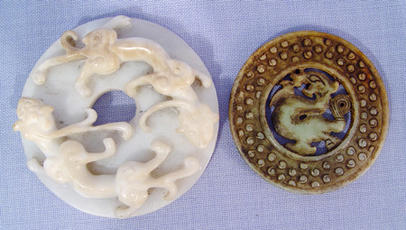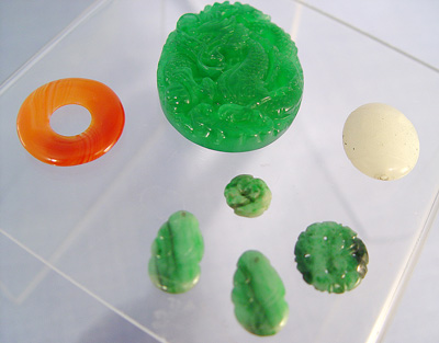 9 PIECE GROUP CARVED JADE AND STONE: To include 2 bangle bracelets, snuff bottle, 4 plaques and a ram shaped wine cup. The beastly vase is 4 1/2''h., the smallest plaque is 1 3/4'' OVAL.