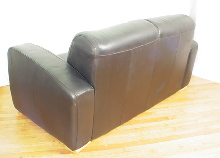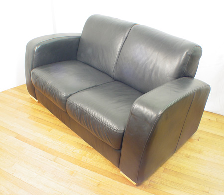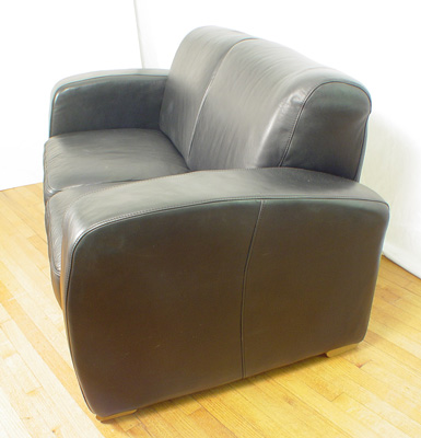 NATUZZI BLACK LEATHER SOFA: Two seater sofa with dramatic curved arms. 34''h. x 64''l. x 31'' deep.
