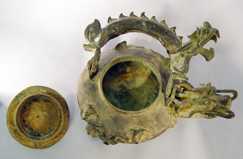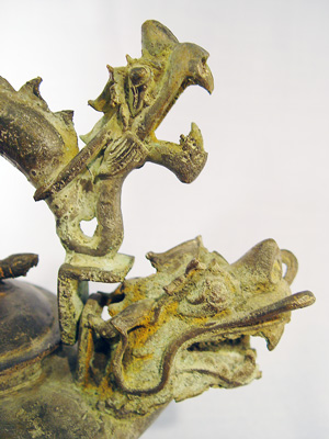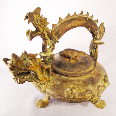 BRONZE DRAGON FORM TEAPOT KETTLE: 8'' h. Actual age unknown.
