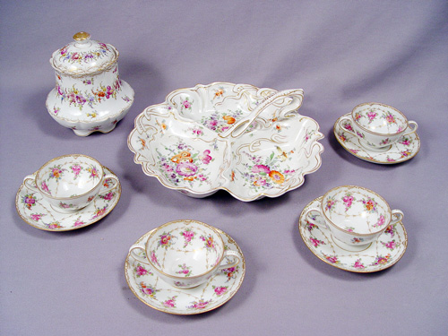 DRESDEN FINE HAND PAINTED GERMAN CHINA GROUP: To include 4 double handle bouillon cups and saucers, a large 6 1/2'' tall covered sugar, and a three section divided dish with handle, 12'' dia. The cups and sugar bowl are Franziska Hirsch, the divided dish is marked D under a crown.