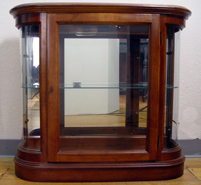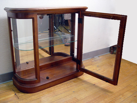 CONTEMPORARY BOW SIDE CURIO DISPLAY CABINET: Single door, illuminated interior with glass shelf and mirror back. 29''h. x 31'' x 11''.