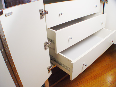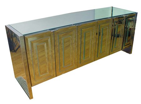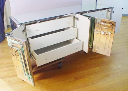 ART DECO STYLE MIRRORED DRESSER: Six panels of layered beveled glass open to reveal six drawers. 29 1/2''h. x 75 1/4'' x 20 1/2''.