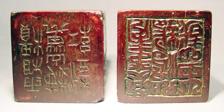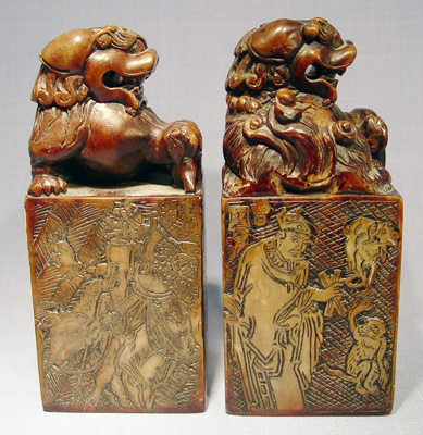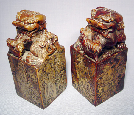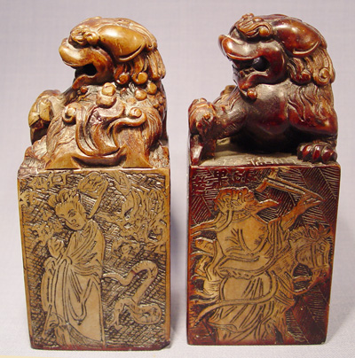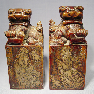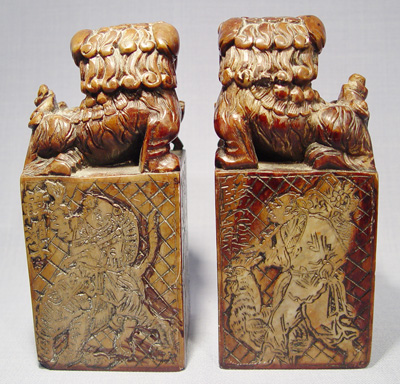 PAIR OF LARGE FOO DOG CARVED SOAPSTONE SEALS: 7'' tall, the base is 3'' square.