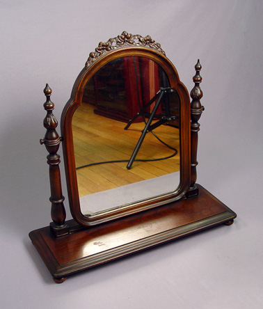 EARLY 20TH C CARVED MAHOGANY SHAVING MIRROR: Dresser top mirror swings between carved supports. 24''h. x 24''l. x 9'' deep.