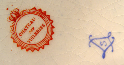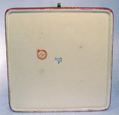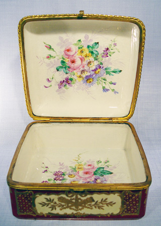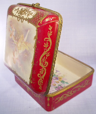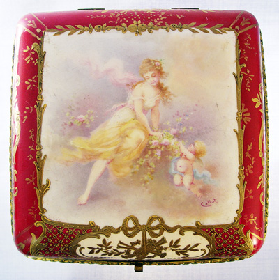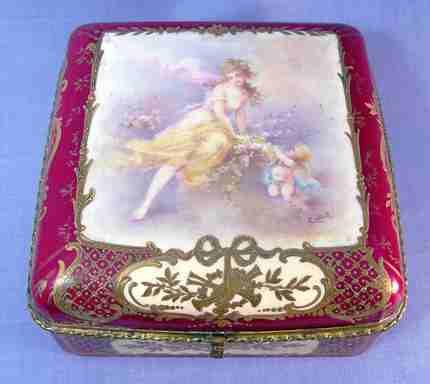 SEVRES FRENCH PORCELAIN BOX: Artist signed hand painted cupid and Venus on the hinged cover, signed Collot. 4''h. x 7 1/2'' x 7 1/2''. Blue cartouche mark with letter s, and Chateau Des Tuileries red mark. Overall crazing on underside and interior. Free of chips or cracks.