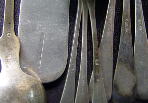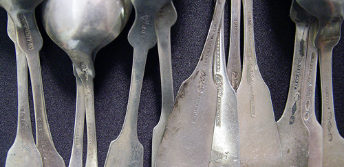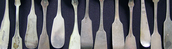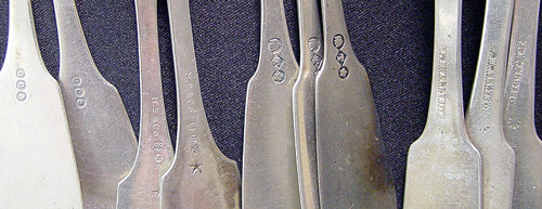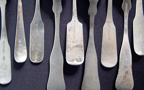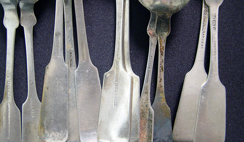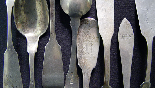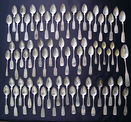 LARGE LOT OF 55 PLUS PIECES COIN SILVER SPOONS: Includes ''Jas.Hyde'', ''W. Mitchell'', ''M.Pearson'', ''A. Sawyer'', ''W.T.Rae & Co.'', ''J.F.Reeves'', ''S.D.& P'', ''S.Mason,Jr.'', ''Harris & Weldon'', ''W.S.Morgan'', ''N.Matson'', ''A.Voorhees'', W.Cline'', ''WWW'', ''Willard Hawley'', ''L.Simmons'', ''H.Rosenberg'', ''N.S.& Co.'', ''G.W.Pratt'', J.M.ALLISON and many more.