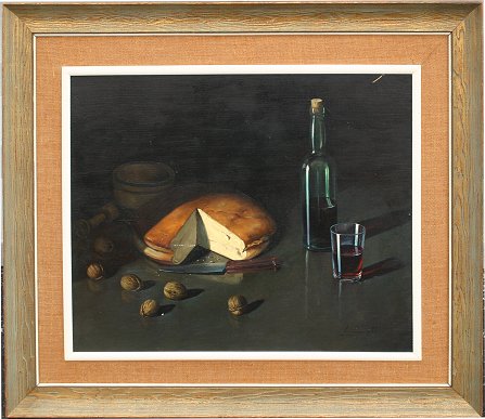 MORELL, Luis, (Spanish, 1911-1985): ''Still Life with Cheese, Wine and Walnuts'', O/C/M, signed, framed, 25'' x 31'', 37'' x 43''. oil/C was torn in shipment, repaired by the artist and laid down.