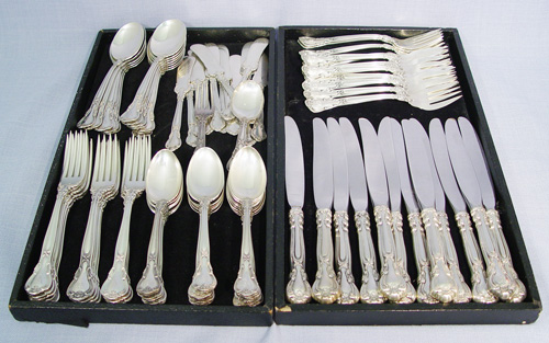 GORHAM ''CHANTILLY'' STERLING FLATWARE SERVICE FOR 12: 86 pieces to include 12 each of dinner knives (9''l), dinner forks (7''l), salad forks, soup spoons and butter knives, 24 teaspoons and a baby fork and spoon. Monogrammed M E H.