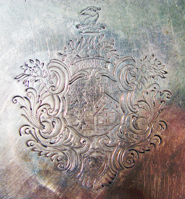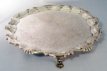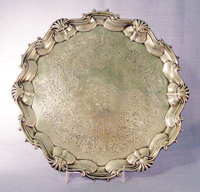 GEORGE II FOOTED STERLING SALVER: London 1749, maker William Hunter, approx. 19.61 oz., 10 1/2'' dia. Shell and scroll border, engraved center surface.