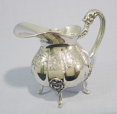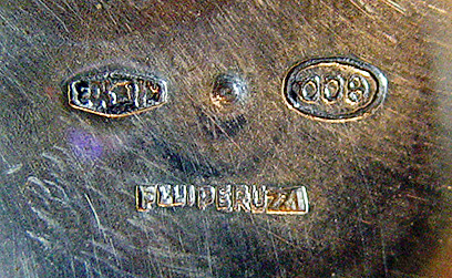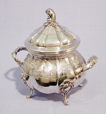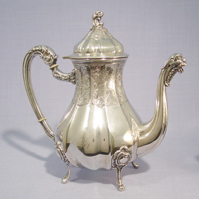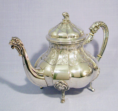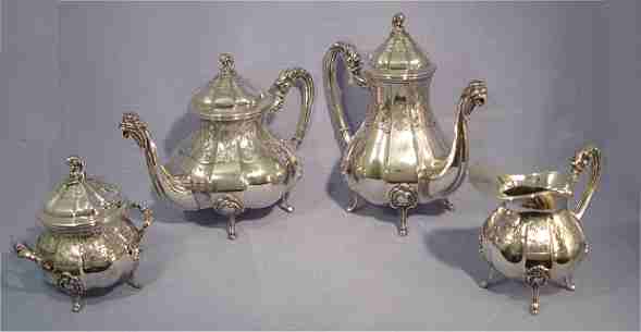 FW PERUZZI 800 FINE ITALIAN SILVER TEA SERVICE: Hand chased 4 piece set to include coffeepot (9 3/4''), teapot, (8 1/2''), cream pitcher and hinged sugar. Note the figural details on the spout.