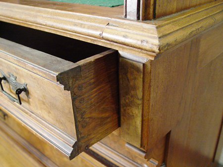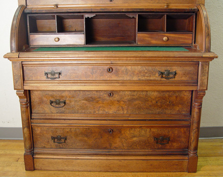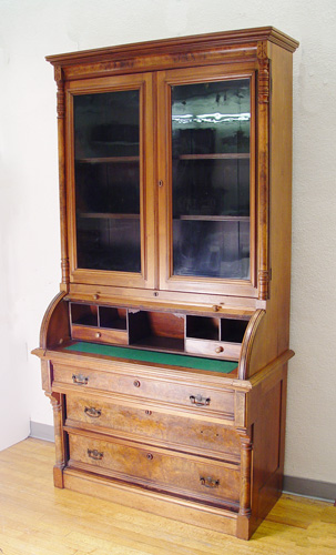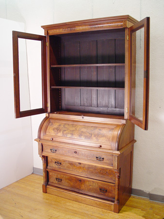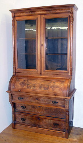 VICTORIAN CYLINDER ROLL TOP SECRETARY BOOKCASE: Glass front upper section with adjustable shelves. Lower section with cylinder roll, compartmented interior, burled panels. Straight top, columnar stiles, 84'' h. x 44'' x 21''.
