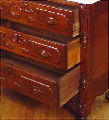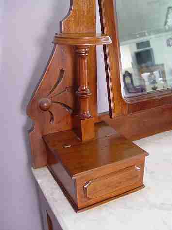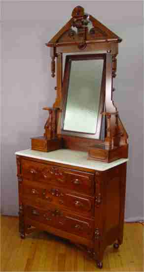 ANOTHER SUPERB VICTORIAN MARBLE TOP DRESSER: Ornate top crest, candle shelves, and glove boxes, three drawers with carved pulls, white marble top. 90''H. X 40'' X 18''.