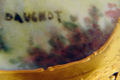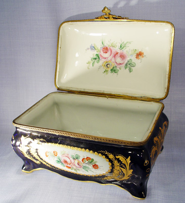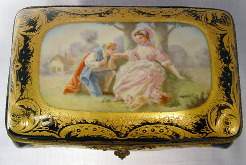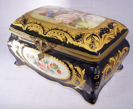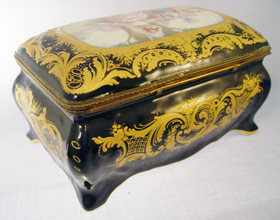 LARGE COBALT AND GOLD PORCELAIN BOX: The hinged cover has artist signed hand painted image of a courting couple, interior painted with flowers. Heavy gilt work frames the painting. Unusual form with scrolled feet. Remnants of a hallmark. 6''h. x 10 1/2'' x 6''.