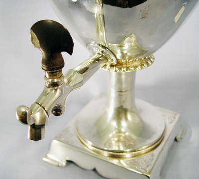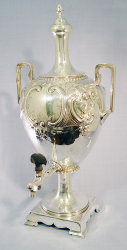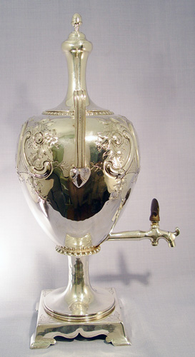 19th C SHEFFIELD SILVERPLATE HOT WATER URN: Floral and scroll design, spigot handle. 20 1/2''h. x 13'' w, including the handles. No monogram.