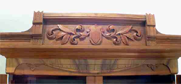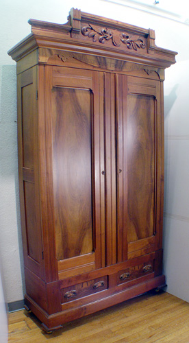FINE VICTORIAN WALNUT ARMOIRE: Carved crest over double doors, divided interior, two drawers across the bottom, paneled sides. Excellent condition. 97''h. x 48'' x 16 1/2''.