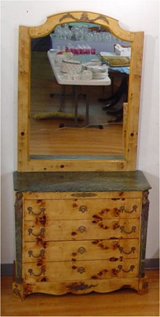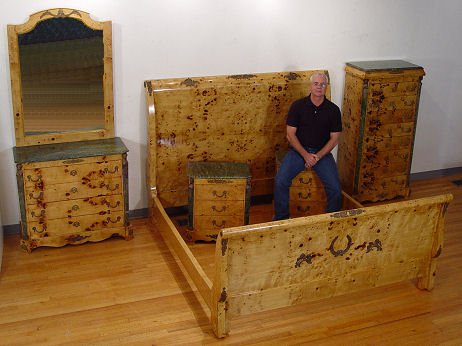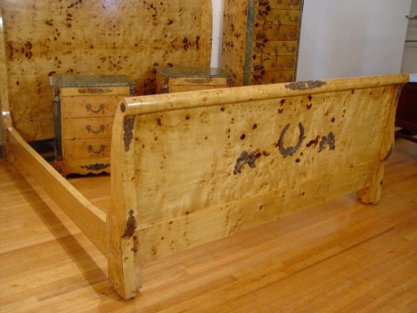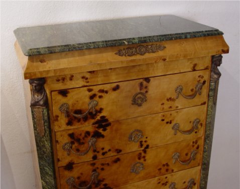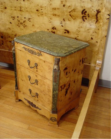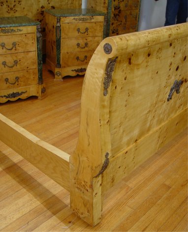 6 PC BIEDERMEIER STYLE NEO-CLASSICAL REVIVAL EXOTIC BURL WOOD BEDROOM SUITE: Mid 20th C European high design furniture. The set includes a sleigh BED (59''h headboard, 37''h footboard), TALL CHEST of 8 drawers (62 1/2''h. x 32 1/2'' x 16''), DRESSER (36'' x 41 1/2'' x 18'') MIRROR (51'' x 38''), and a PAIR OF NIGHTSTANDS (28''h. X 24''w.). Green marble tops and ormolu with lady head masquerons.