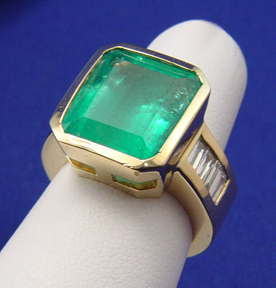WOW - 8.68CT EMERALD RING: Emerald cut emerald bezel set in 14k yellow gold with approx. .75ctw of baguette cut diamonds down the shoulders, size 6.5, 15.9 grams. Sold with current Florida Diamond Appraisers appraisal, retail replacement value $12,850. Est. $6000/8000**