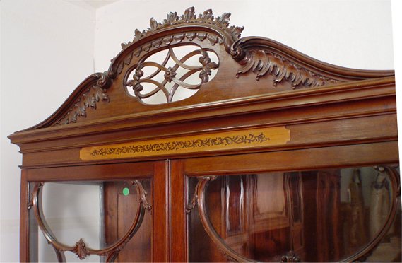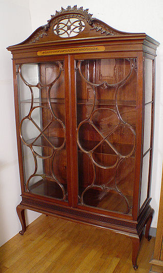 ENGLISH MAHOGANY CHINA CURIO: Inlay frieze over the double doors with 12 shaped lights each, fret carved cornice, cabriole legs. 82'' x 45'' x 19''. Est. $3000/5000**