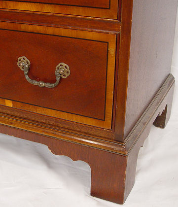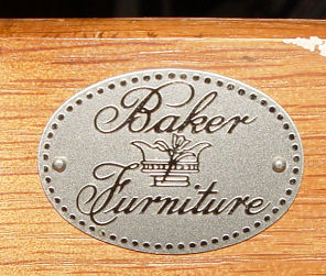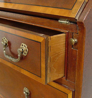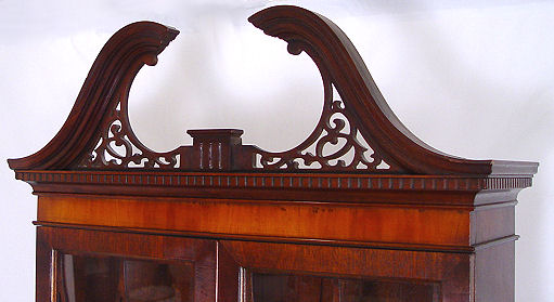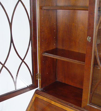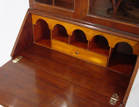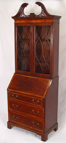 BAKER FURNITURE MAHOGANY SECRETARY BOOKCASE: Pierced fretwork pediment, banded drawer fronts, the interior of the fall front desk is fitted with arches over the pigeon holes and a single drawer. 87''h. x 30 1/4'' x 17''.