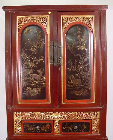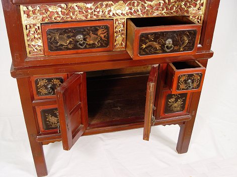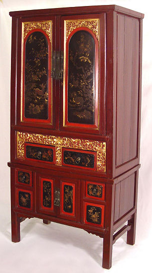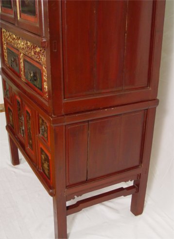 CHINESE RED LACQUER CABINET ON STAND: Hand painted and gilt wood panels on drawer and door fronts. The upper section interior has 2 drawers and open space, one drawer locks with included key. Thru tenon construction. 79''h. x 39 1/2'' x 23'' both pieces overall, the lower stand alone is 28''h.