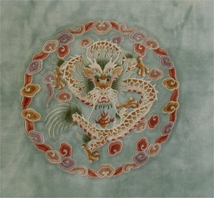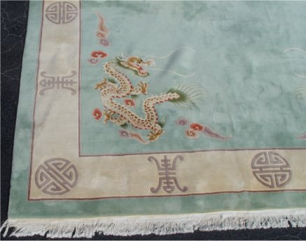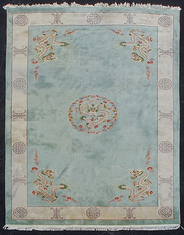 LARGE CHINESE DECO CARPET: 18'5'' x 12'1''. Mint green ground, dragon medallions.
