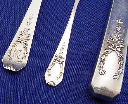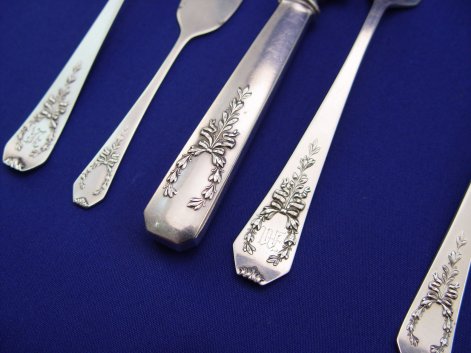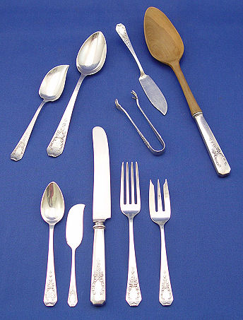 GORHAM STERLING FLATWARE IN THE ''MADAM JUMEL'' PATTERN: 59 pieces to include 8 French blade dinner knives (8 3/4''l), 8 dinner forks (6 6/8''), 16 salad forks, 14 teaspoons, 6 butter spreaders, a master butter, a sugar tong, a tablespoon, a wooden bowl salad spoon, and a jelly server. Most pieces are monogrammed ''M''.