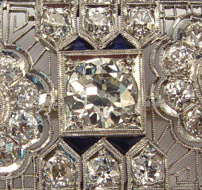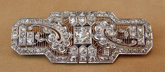 8.62ctw PLATINUM FILIGREE DIAMOND BROOCH: Set with old European cut diamonds, largest stone being approx. 1.57cts, 7.5 x 4.54mm, J color and VS2 clarity. Pin overall encrusted with an additional 104 round full and European cut diamonds, average H-I-J color and VS2-SI2 clarity. Accented by four triangular cut synthetic sapphire stones, synthetic colored stones are normal for the period being depicted. Approx. 23.7 grams, 2 13/16'' x 1 1/16''. Sold with current Florida Diamond Appraisers appraisal, retail replacement value $25,000.00. Est. $9000/12000**