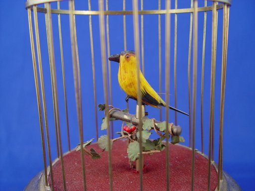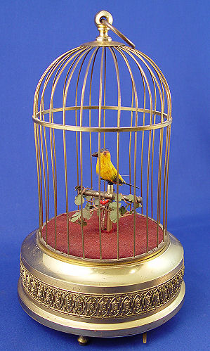 GERMAN SINGING BIRD AUTOMATON: In good working order. A single feathered animated bird in brass cage. Bottom marked Germany Ken D. 11''h.