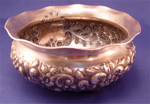 GORHAM STERLING REPOUSSE BOWL CA. 1895: Ruffle rim footed bowl with repousse body with cartouche for your own monogram. Approx. 13.37 oz. No monogram.