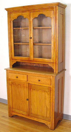 AMERICAN COUNTRY CHESTNUT CUPBOARD: 2 Part with upper section having double doors with arched glass doors, lower section having 2 drawers over cabinet doors. Paneled sides. 80 1/2''h. x 40'' x 18''.